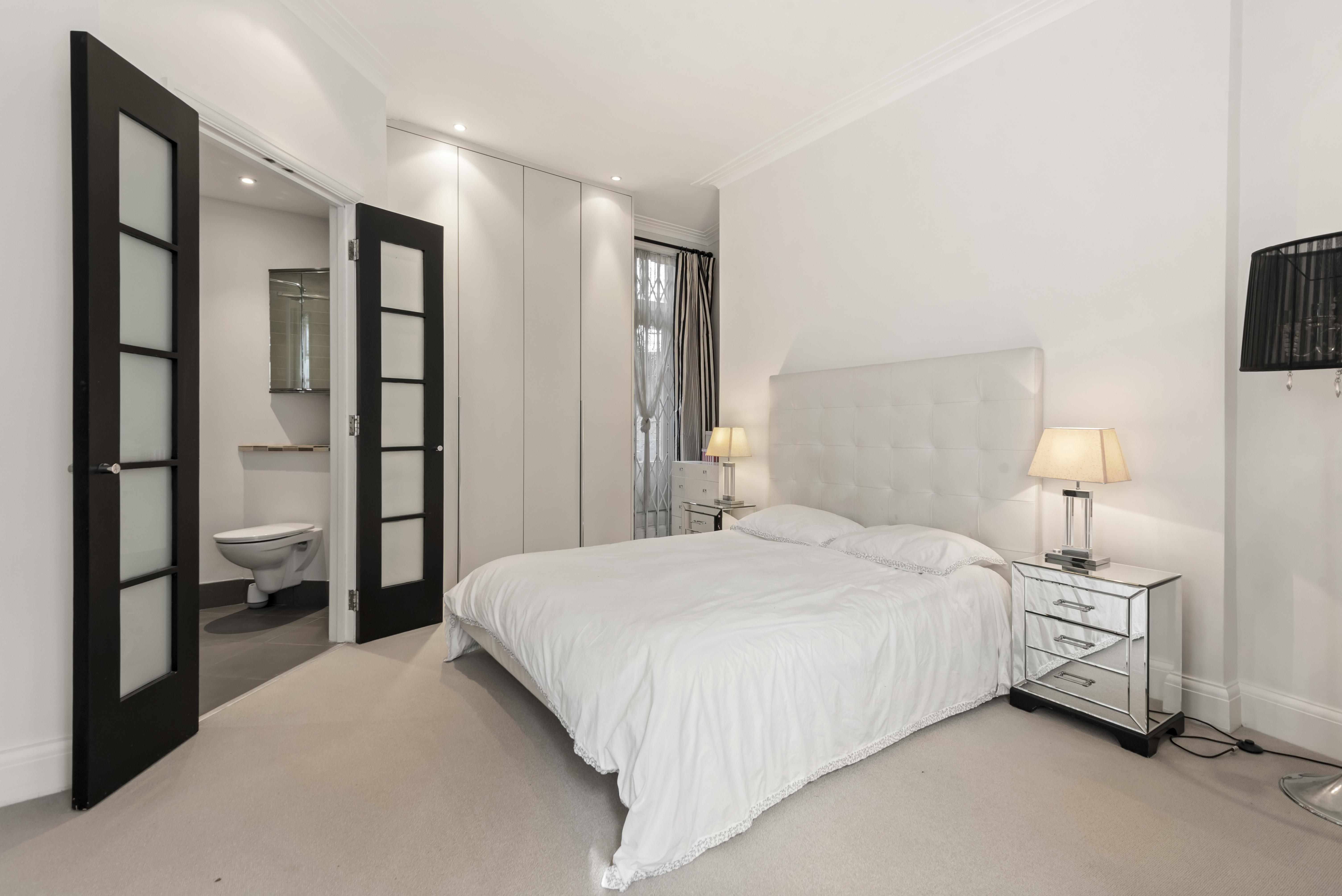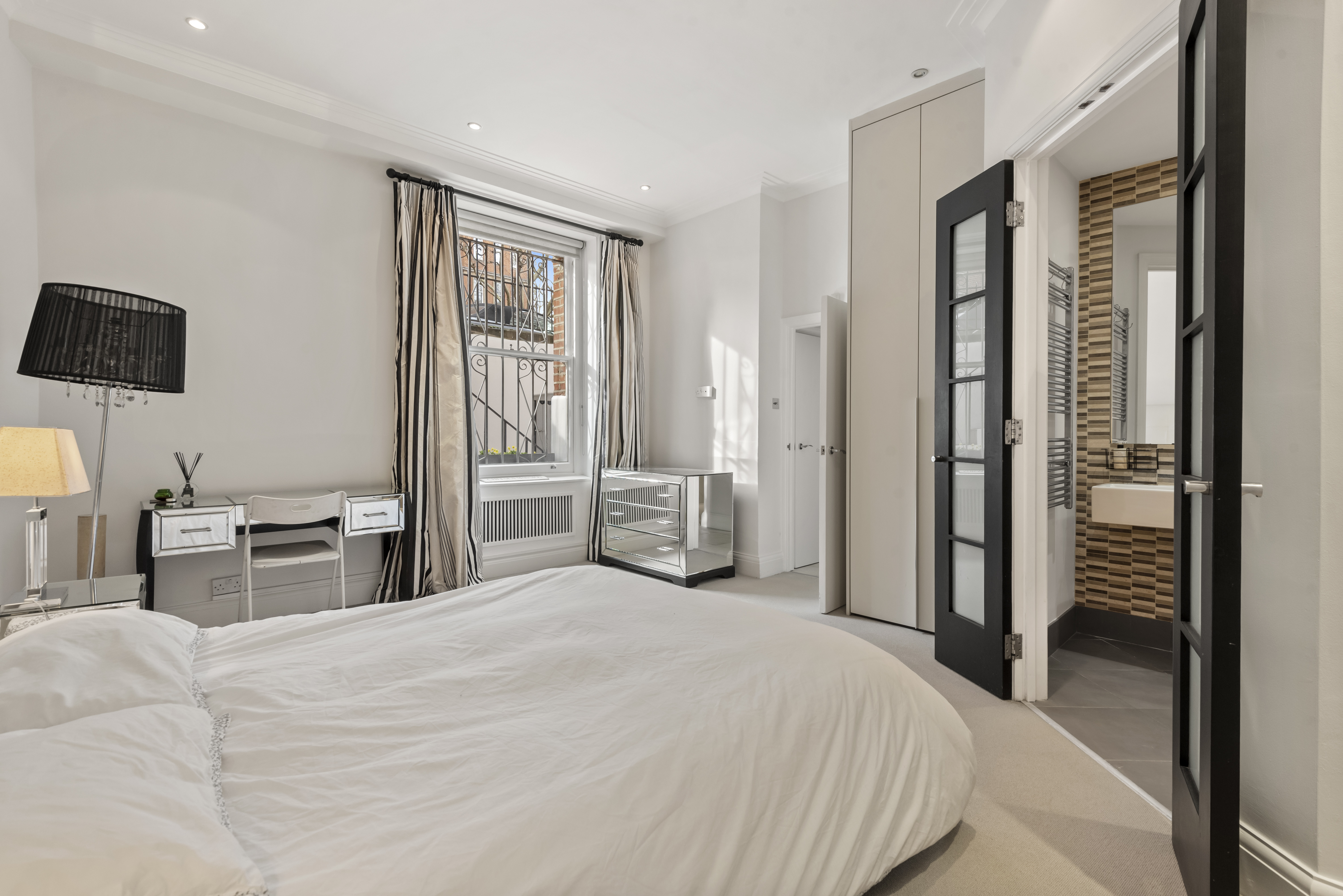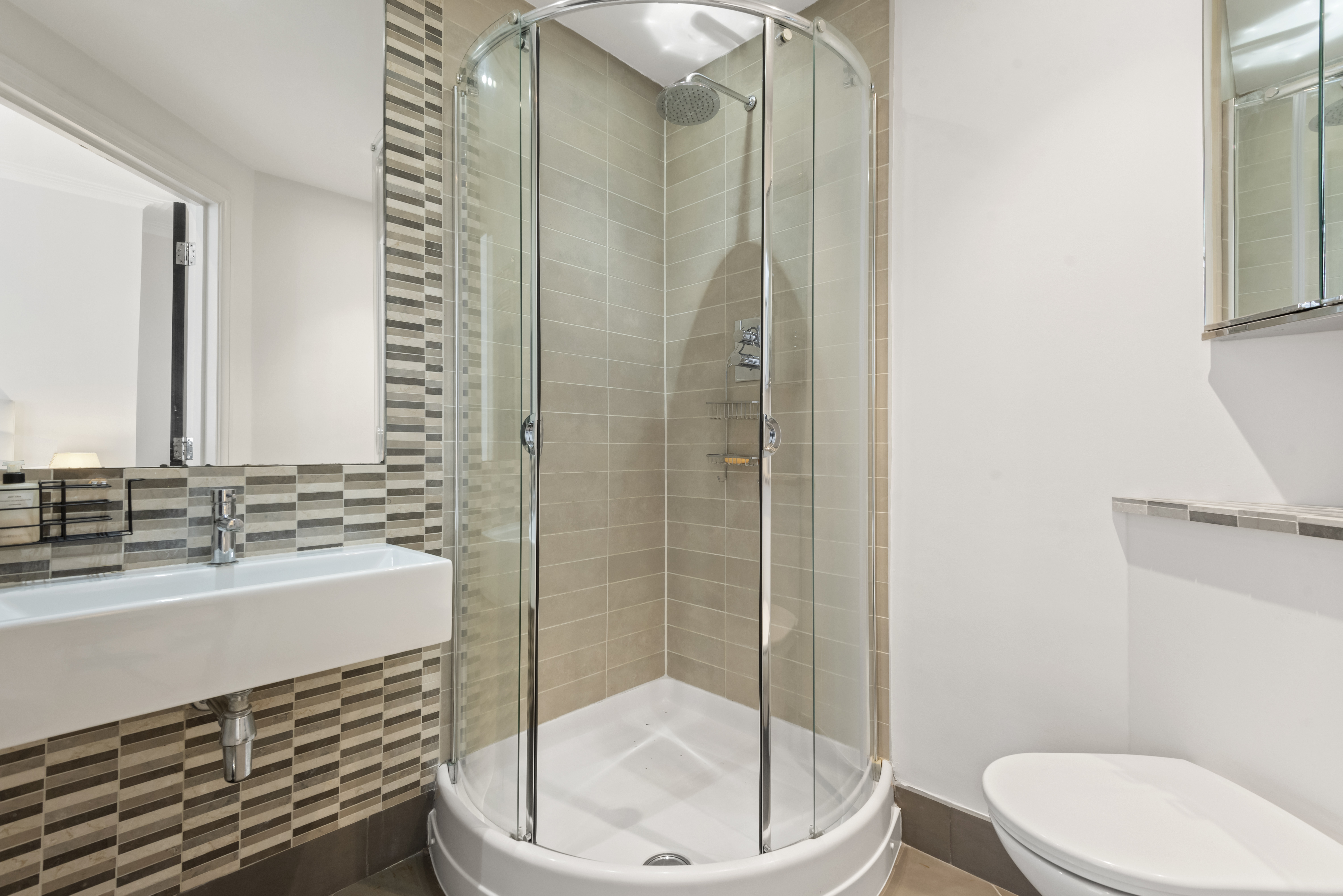 The principal bedroom benefits from an en suite shower room and access to a private patio. There is a further double bedroom, a third bedroom/study, plus a family bathroom and additional shower room.